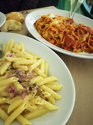 140 grammi. No me podía ir de Italia sin comer auténtica carbonara, así que fuimos a este local donde los platos son bastante generosos. Os aseguro que con un plato comen dos personas. Pedimos carbonara y mirtosa, salsa típica de Cerdeña. En total, los dos platos de pasta más la bebida fueron 26 euros.